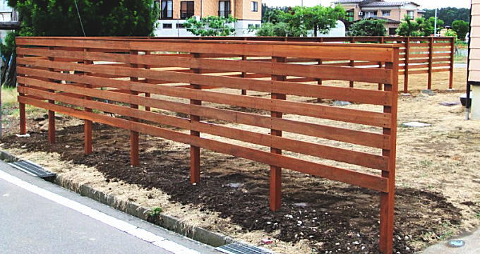 天然塗料によるカラーリングも可能 雨や雪に強いハードウッド素材を使用し、長い年月に耐えるウッドフェンスを製作しています。